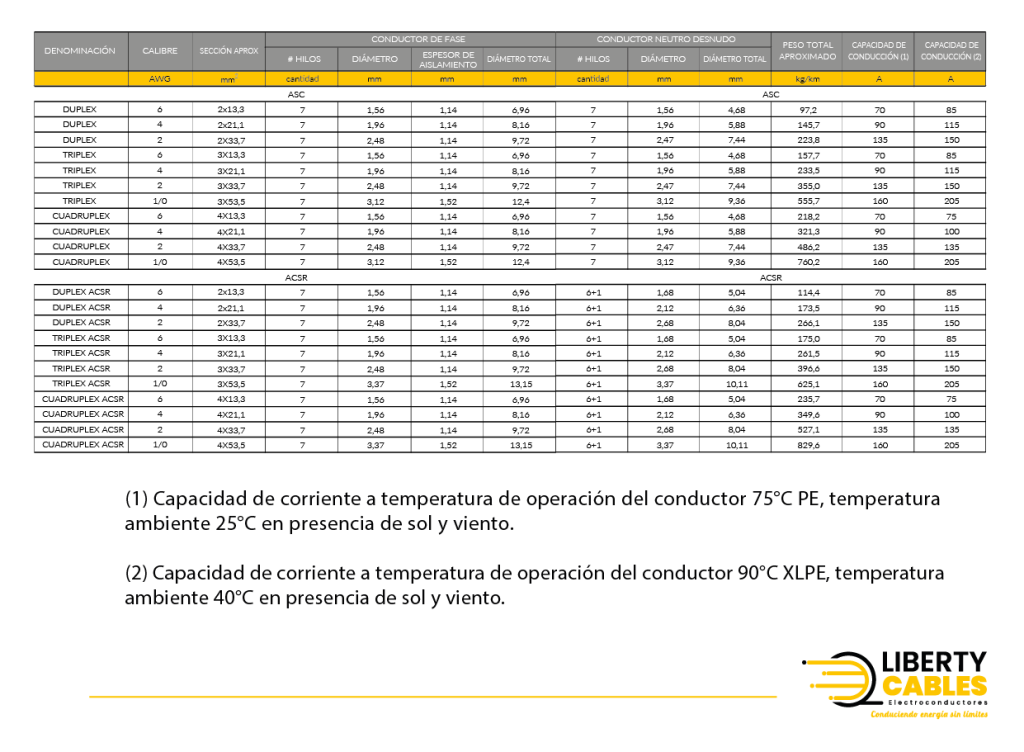 Cable de aluminio 1350-H19 cableado concéntricamente aislado con Polietileno de Baja Densidad (LDPE) 75°C, o Polietileno Reticulado (XLPE) 90°C, neutro mensajero desnudo en AAC o ACSR según la aplicación.